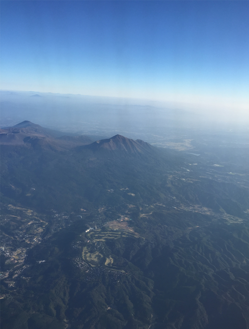 天孫降臨の場所、高千穂の峰と霧島連山、新燃岳のスナップを今朝の帰りの飛行機で撮りました。