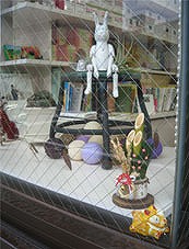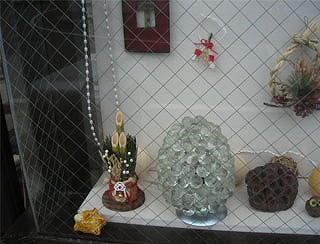 お店の入り口の両側のガラス窓にミニチュアの門松を配してみました。