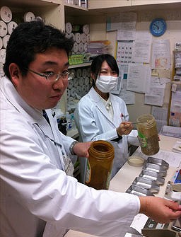 薬科大学5年生の薬局実習の一環で、先日2名の学生が漢方製剤の実習にきました。