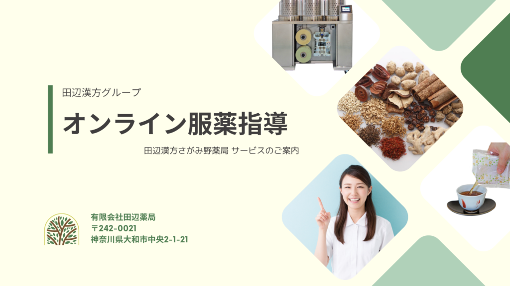 1,受診時に漢方薬の調剤が可能なオンライン服薬指導の応需薬局「田辺漢方さがみ野薬局」をご案内ください